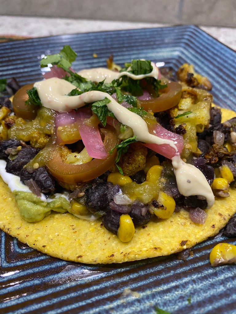 Did you really think we wouldn’t have a Cauliflower taco recipe considering how obsessed we are with the vegetable? This taco has everything you would want in a meatless favorite – spicy crunchy veggies, protein packed beans topped with our favorite pickled onions and jalapeños! We tend to prep a few different meals on Sundays that we can use for the week, more often than not, this cauliflower is on that list because of its versatility. We love them in tacos but this topping also works amazing for tostadas and even Mexican bowls if you whip up some of our cilantro rice.