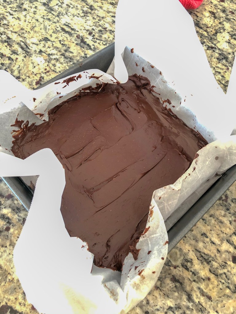 - Pour into parchment paper lined pan and allow to cool 3-4 hours