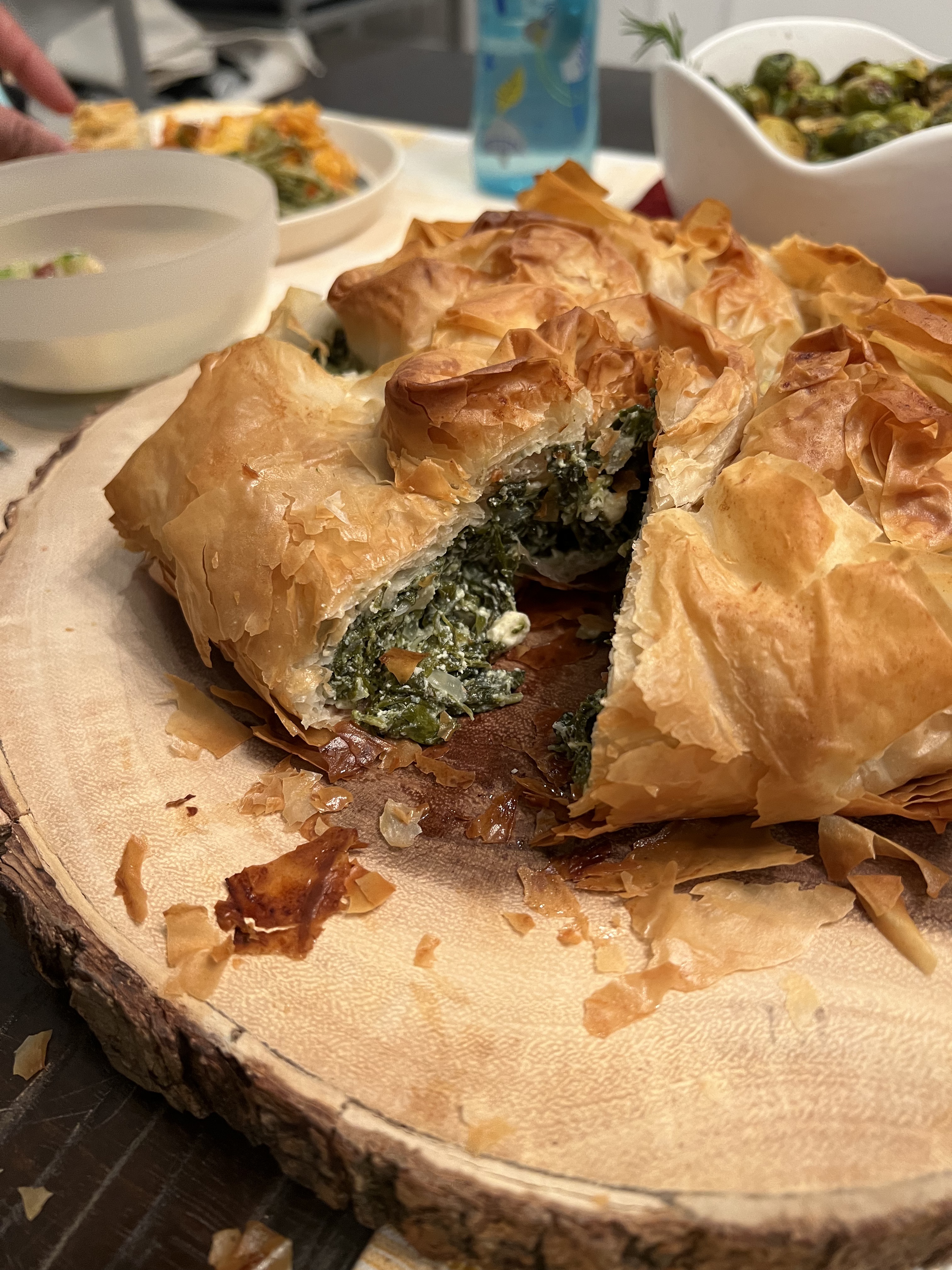 - Add the spinach mixture to the middle of the phyllo set up and pull the edges of phyllo onto the center