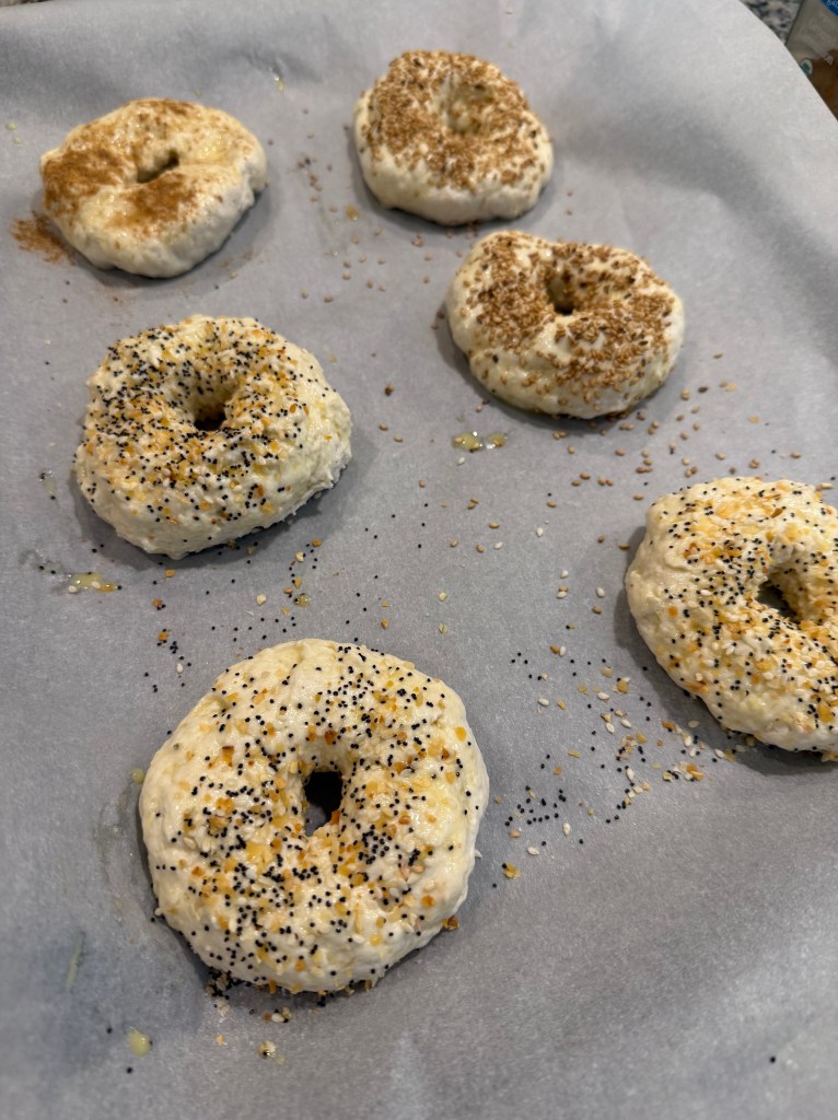 These aren’t your traditional New York-style bagels. The texture is more bread-like and soft rather than ultra chewy. If you’re expecting that classic dense chew, just know these lean more “quick homemade bread meets bagel-shaped snack.”